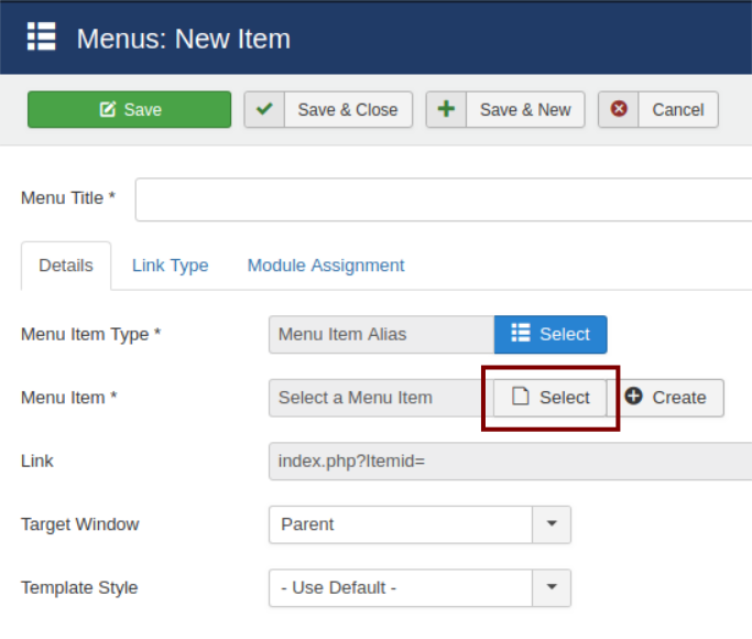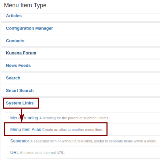 Step 2) Select Menu Item Type = Systemlinks -> Menu Item Alias