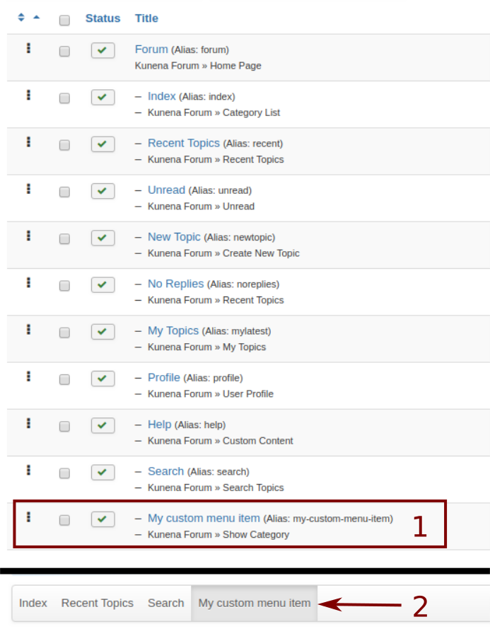 As you can see, the menu item is listed correctly in the Kunena menu (1) and the tab is available in the frontend (2).