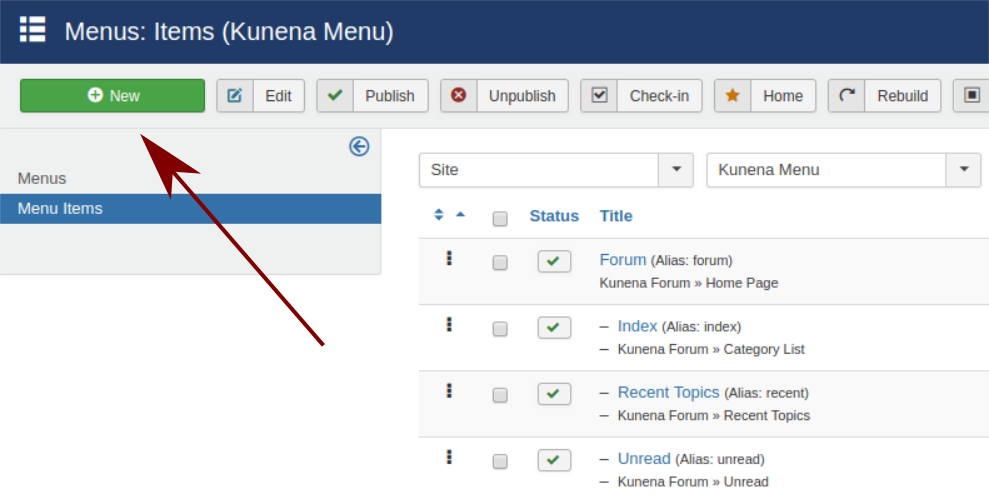 Step 1) Go to Menu Item Manager: Menus -> Kunena Menu and click on New