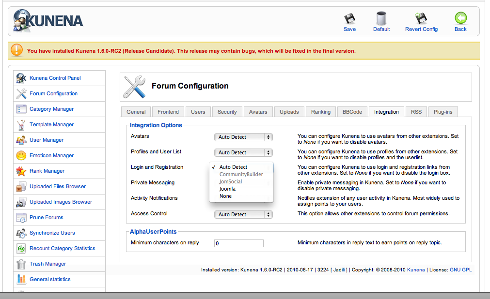 Replied by sozzled on topic Re: Kunena 1.6.0-RC1 # 3163 - Community Builder login integration is not working