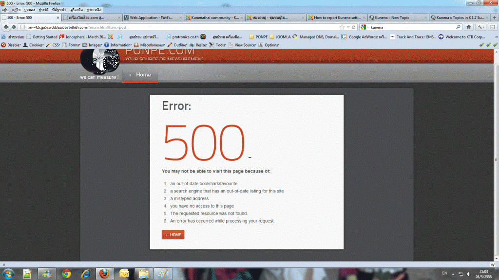 (2) Your image shows "Error 500" but the description looks like a HTTP 404 Page Not Found Error. Again, because we cannot visit your website, I cannot tell if the error relates to a HTTP 404 Page Not Found Error or whether it relates to a HTTP 500 Internal Server Error . One thing is sure. Your Joomla/Kunena menu is all wrong. Please read the FAQs page (at the top of this forum page) for How do I restore my Kunena menu?