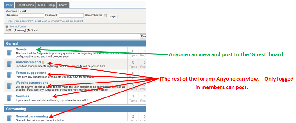 Setting 'Guests' to everyone is fine (so long as I have Allow Guests to post/write set to Yes), but setting all others to 'Registered' actually hides them, I need them to be viewable.