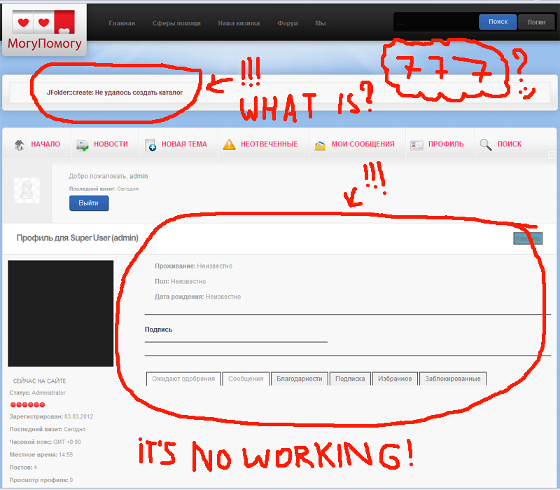 Problem 2: Can not modify and customize any information in the user profile on the forum. Appears: JFolder :: create: Could not create directory.