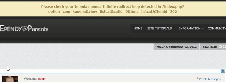 Please check your Joomla menus: Infinite redirect loop detected in /index.php?option=com_kunena&view=listcat&catid=0&func=listcat&Itemid=202