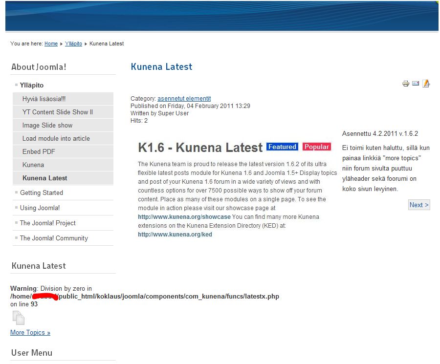 - when new item posted to Kunena Forum 1.6.3., it shows an error in "Kunena latest module": "....com_kunena/funcs/latestx.php on line 93"