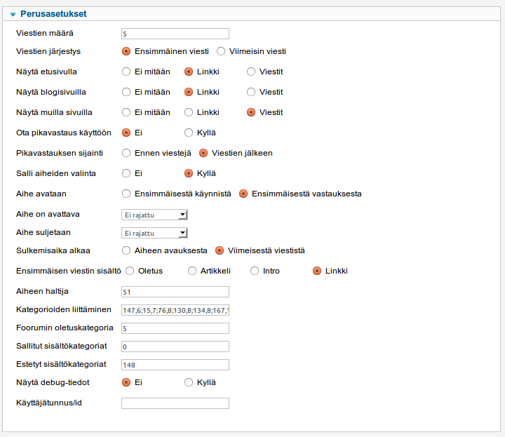 ID Name Menutype Link Path 100205 Keskustele mainmenu-fi view=home&defaultmenu=100090 osallistu/keskustele 100090 Foorumi kunenamenu view=home&defaultmenu=100092 foorumi-100090 100091 Kategoriat kunenamenu view=category&layout=list foorumi-100090/kategoriat 100092 Viimeiset aiheet kunenamenu view=topics&layout=default&mode=replies foorumi-100090/viimeiset 100093 Uusi aihe kunenamenu view=topic&layout=create foorumi-100090/uusiaihe 100094 Ei vastatut kunenamenu view=topics&layout=default&mode=noreplies foorumi-100090/eivastatut 100095 Aiheeni kunenamenu view=topics&layout=user&mode=default foorumi-100090/aiheeni 100096 Profiili kunenamenu view=user foorumi-100090/profiili 100097 Säännöt kunenamenu view=misc foorumi-100090/saannot 100098 Ohje kunenamenu view=misc foorumi-100090/ohje 100099 Haku kunenamenu view=search foorumi-100090/haku