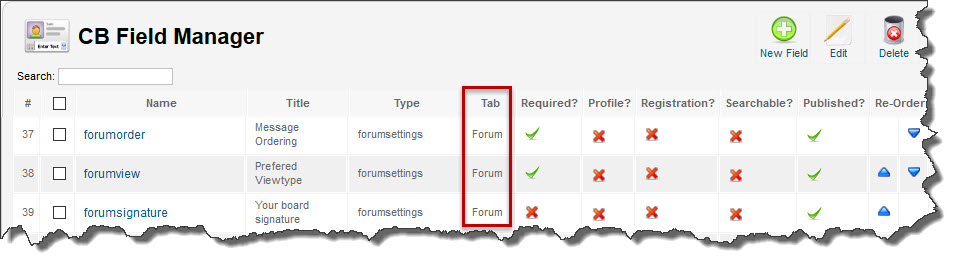 For some reason there are NO fields in the new site for CB field Management, related to tab "Forum".