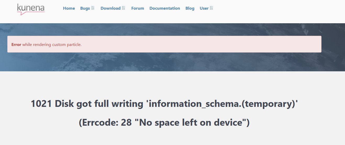 When I close the forum and then select it again, the following message appears in the middle of the screen: 3 Error writing file “/tmp/#sql-temptable-3fa867-351e0-19640.MAD” and below that (Errcode: 28 ‘No space left on device’)