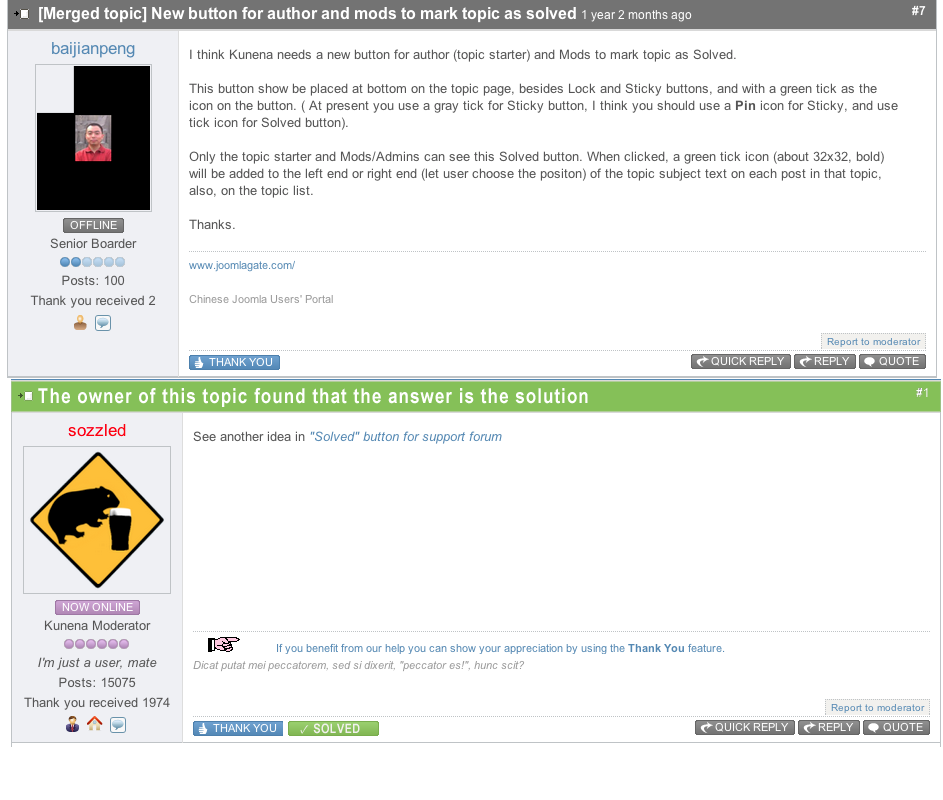 — Kunena forum should be restricted to one color threads and posts marked as "SOLVED". Marking the topic, theme icons, backgrounds beams under the title subject, button "SOLVED" - all in one color. It certainly increase the readability and further differentiate threads "SOLVED".