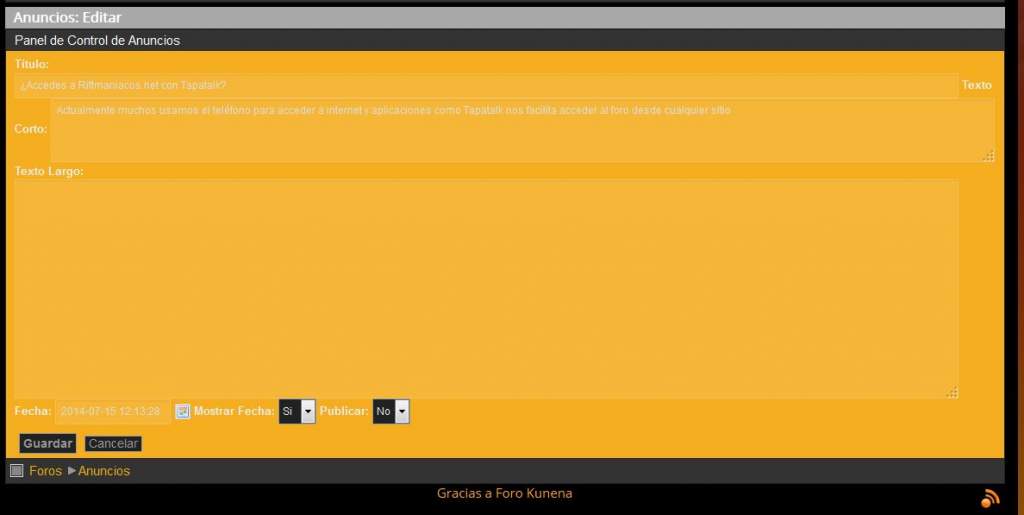 Matias wrote: They are called "Announcements". If you log in as administrator, you are able so see a link to announcements just below the Kunena menu (look the right side of the profile box if you're using default template).