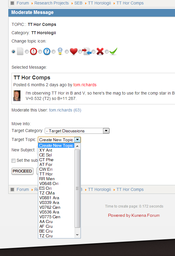 I am now in the process of taking the old thread and merging them into the threads created to discuss each article. The Moderate Message function has worked perfectly in doing this. At least until I got to a point where the number of new topics seems to have exceeded the visible items in the Target Topic dropdown list.