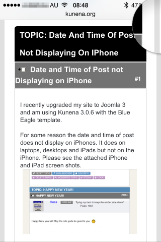 That is correct. It is a "feature" of the Blue Eagle "responsive" template.Jax wrote: For some reason the date and time of post does not display on iPhones.
