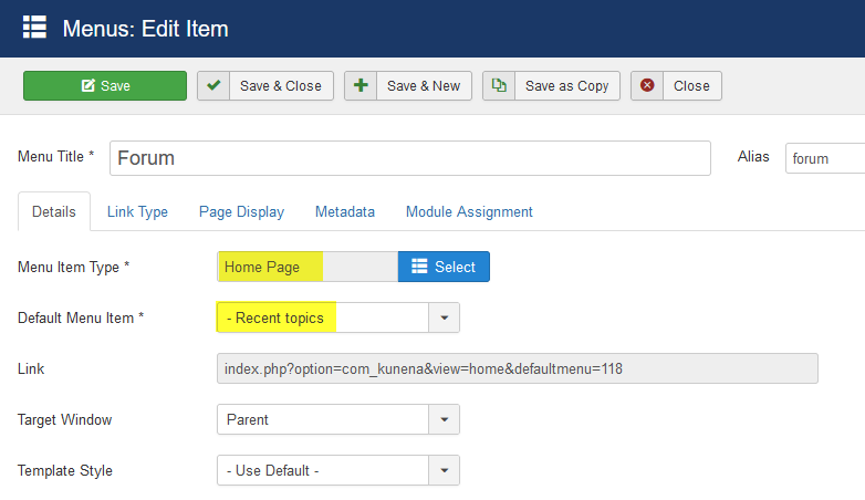 And Forum's setting > [Menu Item Type]:Home Page / [Default Menu Item]:Recent topics