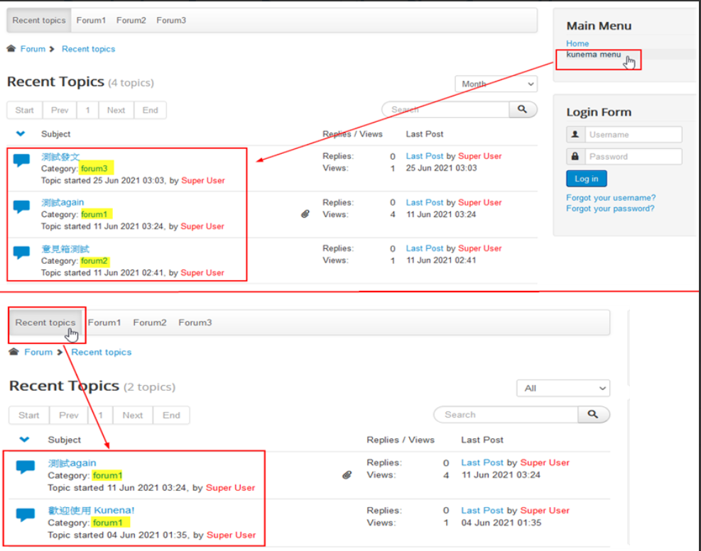 "kunena menu" should equal "Recent topics" , just show "Forum1", but it's not