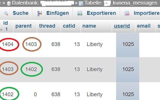 For example, in table _kunena_messages for topic #1402 strings look like so, where #1404 - last post.