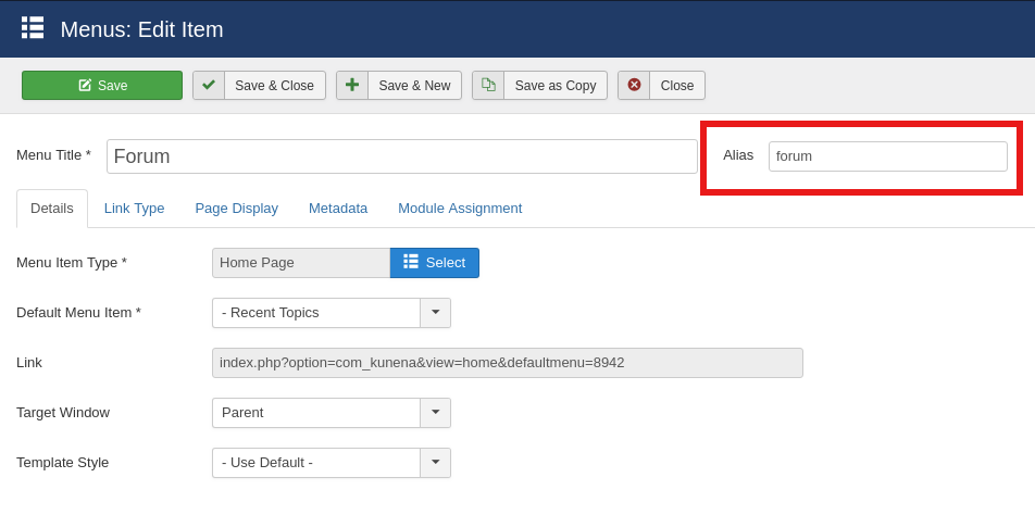 ID Name Menutype Link Path In trash 130 Forum kunenamenu view=home&defaultmenu=131 kunena No 131 Index kunenamenu view=category&layout=list kunena/index No 132 Recent Topics kunenamenu view=topics&mode=replies kunena/recent No 133 New Topic kunenamenu view=topic&layout=create kunena/newtopic No 134 No Replies kunenamenu view=topics&mode=noreplies kunena/noreplies No 135 My Topics kunenamenu view=topics&layout=user&mode=default kunena/mylatest No 136 Profile kunenamenu view=user kunena/profile No 137 Help kunenamenu view=misc kunena/help No 138 Search kunenamenu view=search kunena/search No 159 Users kunenamenu view=user&layout=list kunena/users No